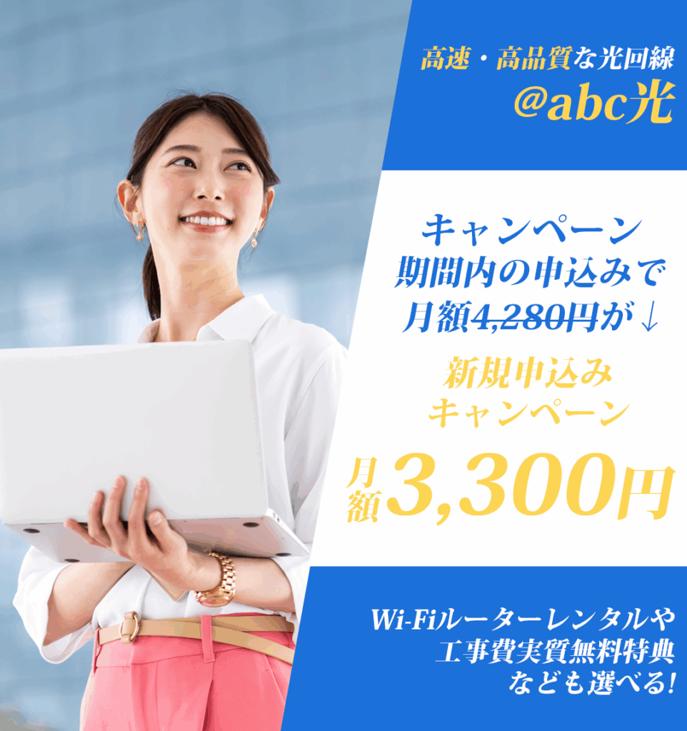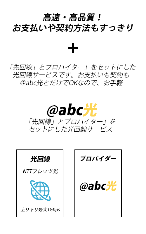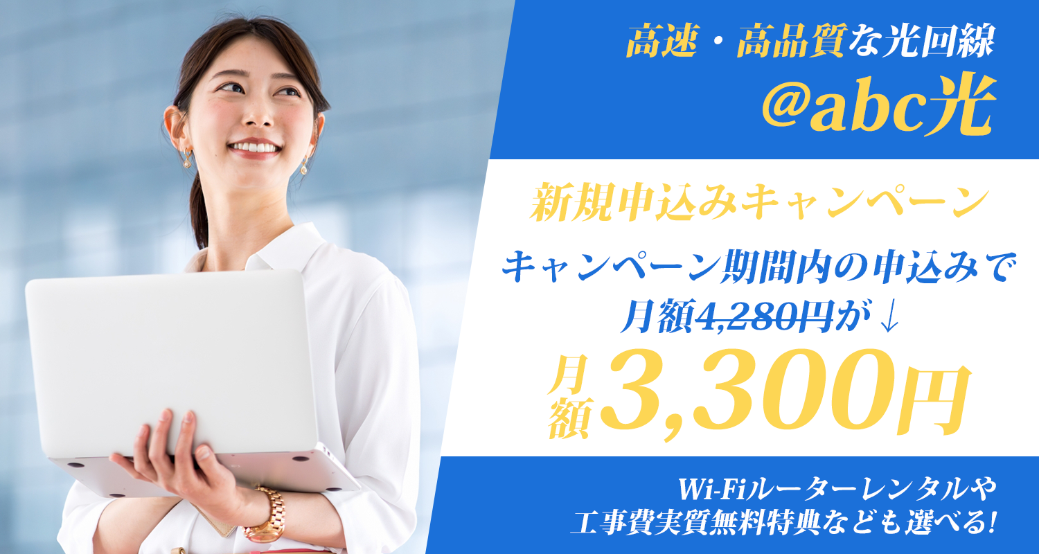 ※ キャッシュバック特典は、開通月含む10カ月目、12カ月目に、ご登録いただいたお受取口座へ現金振込いたします。お受取方法や特典の詳細については、振込予定月前月に@abc入会時に発行されたメールアドレス宛にご連絡いたしますので、必ずご確認ください。