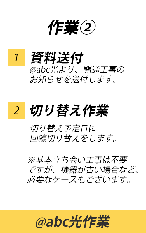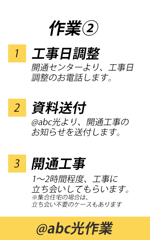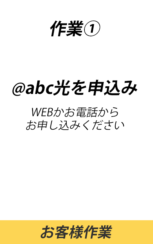 ※「@abcスタートキット」「問通のご案内」は、お届け先の住所がそれぞれ異なりますのでご注意ください。「@abc スタートキット」は登録住所(お申し込み時に@abcにご登録いただいた住所)、「開通のご案内」は設置先住所(インターネット回線を設置する場所の住所)にお届けいたします